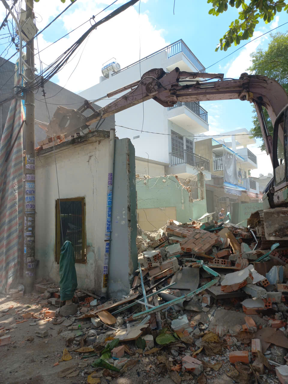 Tháo dỡ nhà cũ bằng máy múc trong khu dân cư